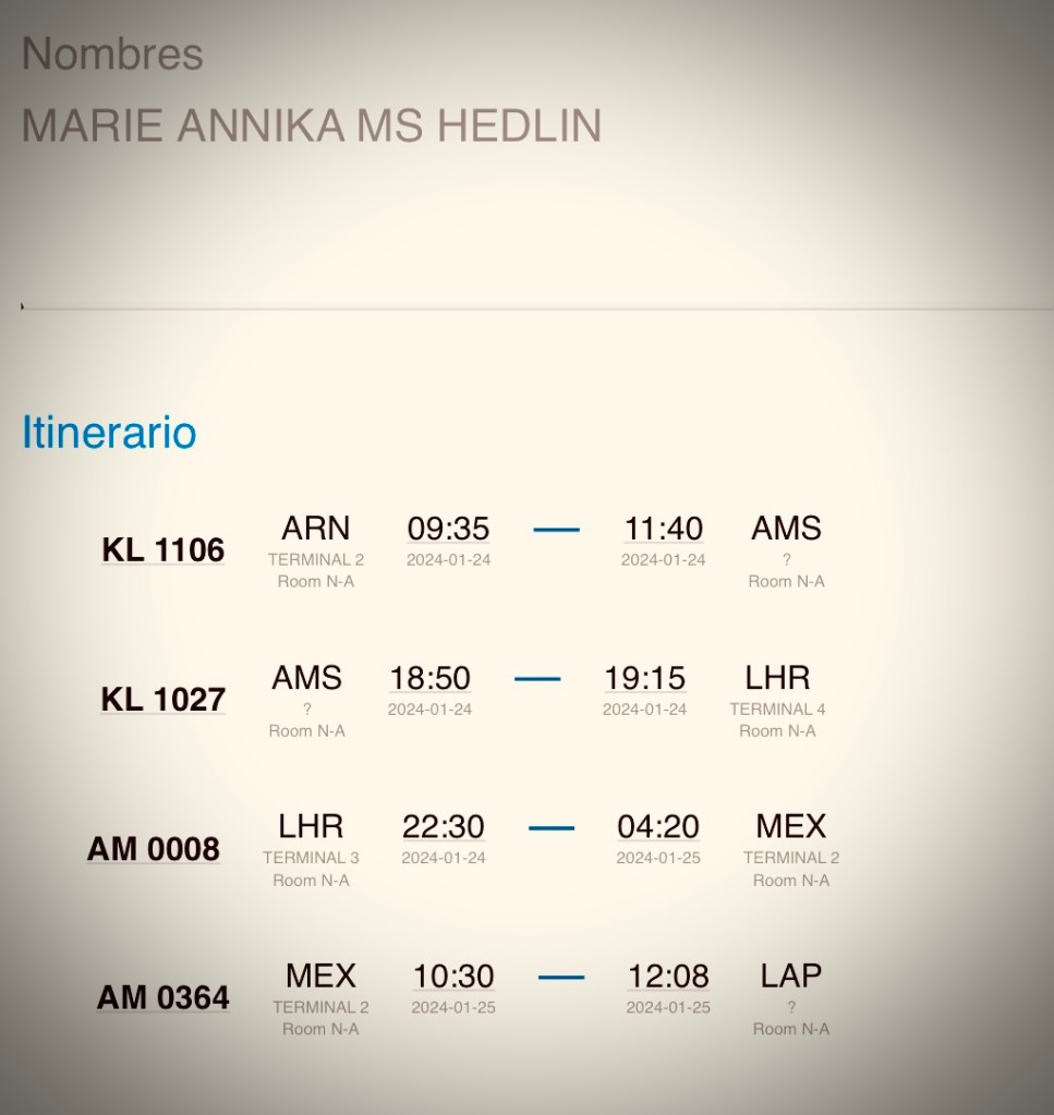 Förseningen innebar att jag missade flyget till Mexiko City och fick därför åka till London för att därifrån komma med ett annat flyg till Mexiko och där ta flyget till La Paz.