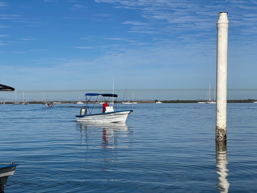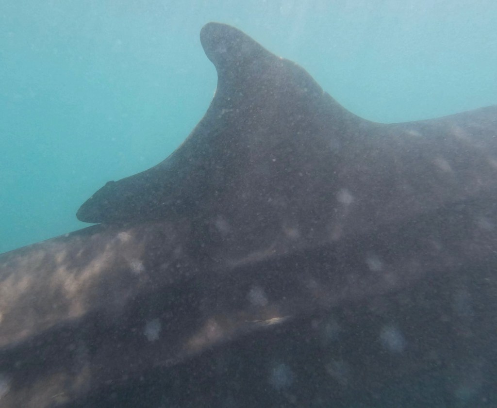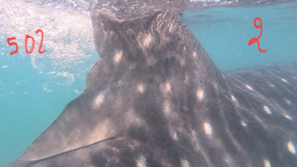 Flera av valhajarna hade skadade ryggfenor. När de är skadade på det sättet är det båtmotorer som har orsakat det. Två av valhajarna hade pilotfishes som var gula med svarta ränder som simmade framför och under dom, vilket betyder att valhajen varit bukten länge.
