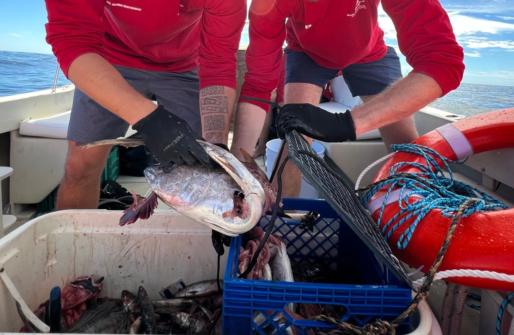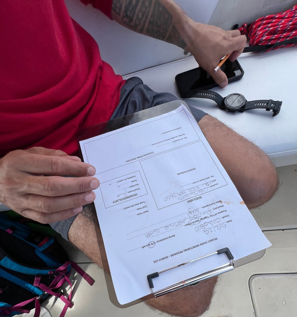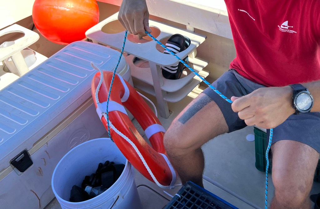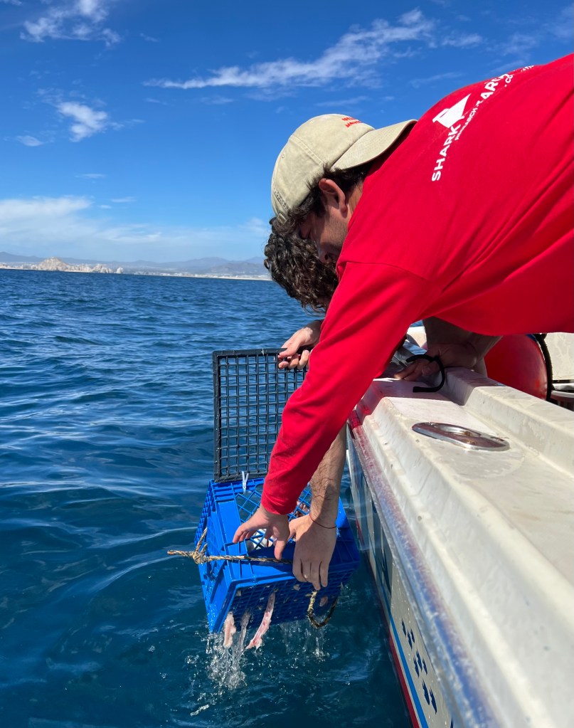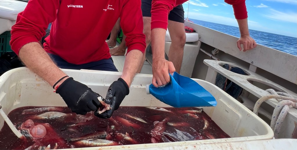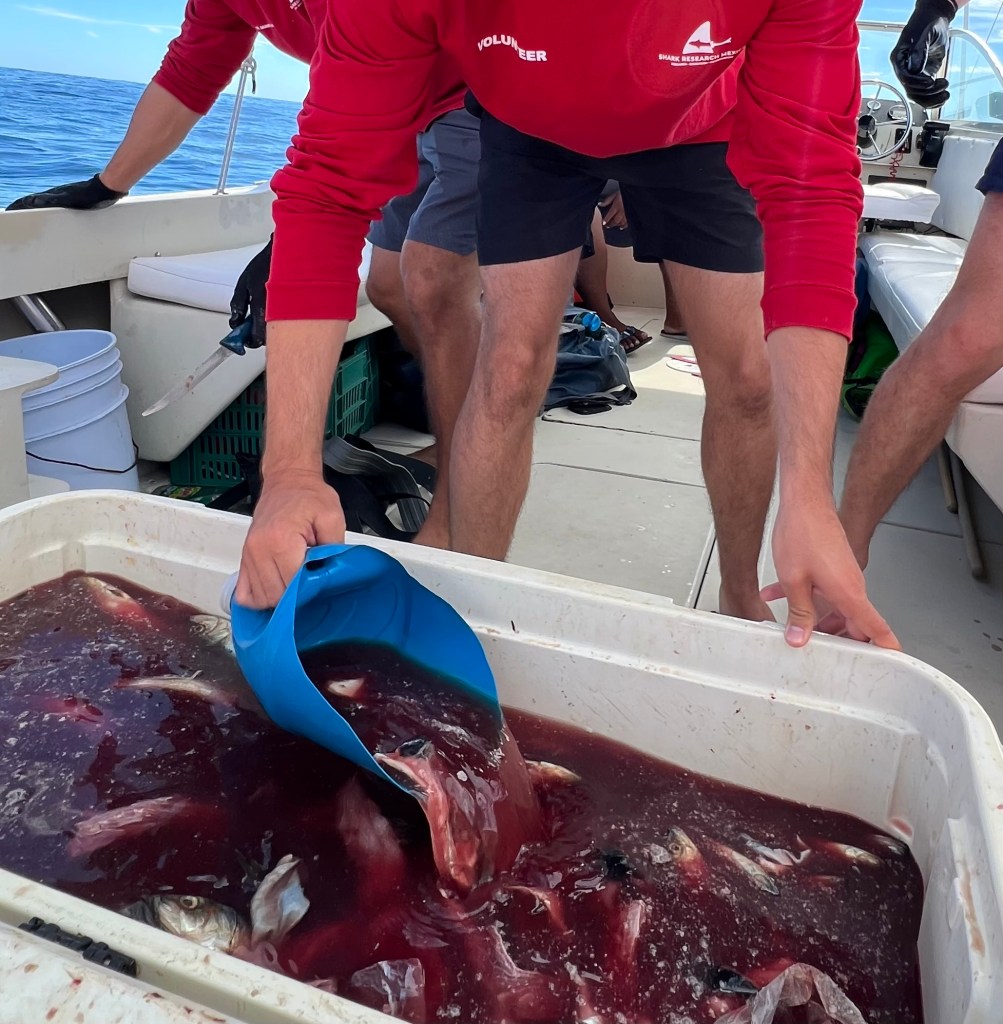 Allt flöt på bra, kaptenen och båten var bra och när vi var på plats ute på öppna havet började vi förbereda ”chum” – dvs vi mosar fiskrester i vatten och skopar ut vattnet i havet för att med doften av det locka till oss haj. En låda med lock fylls med fisk och läggs i vattnet som sitter fast i en livboj samt ett stort fiskhuvud som fästs i ett rep med en fender. Vi höll på ca 2 timmar utan att se en haj så långt öga kunde nå. Vi tror dock att vi såg fenan av en hammarhaj, men den var ca 50 meter från båten så det var svårt att avgöra. Normalt är hammarhajen väldigt skygg, men de sågs i Cabo igår.
