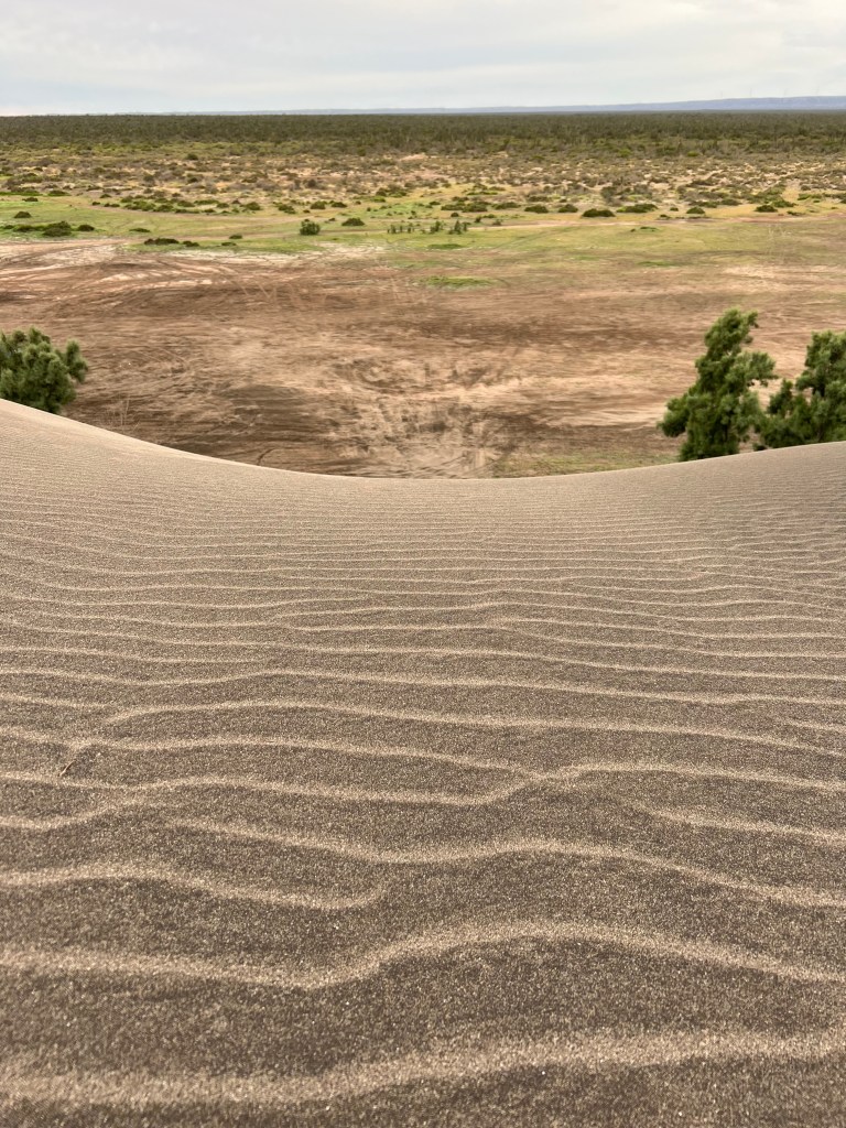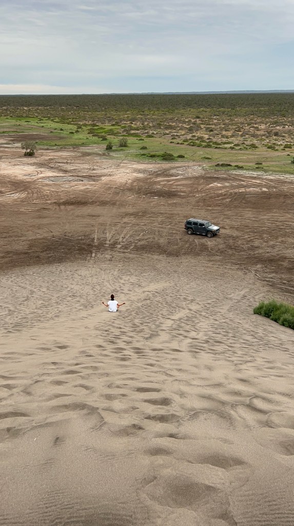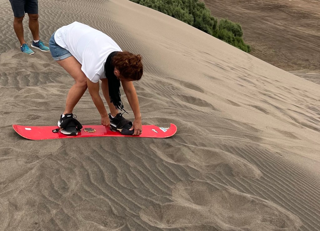 På eftermiddagen tog Darren med oss till sanddynerna dit folk åker för sandboarding. Brädorna ”vallades” med stearinljus för att glida fortare på sanden. Jag provade. Väldigt speciell natur – havet möter strand och stora sanddyner för att övergå i öken med kaktusar. Fint.