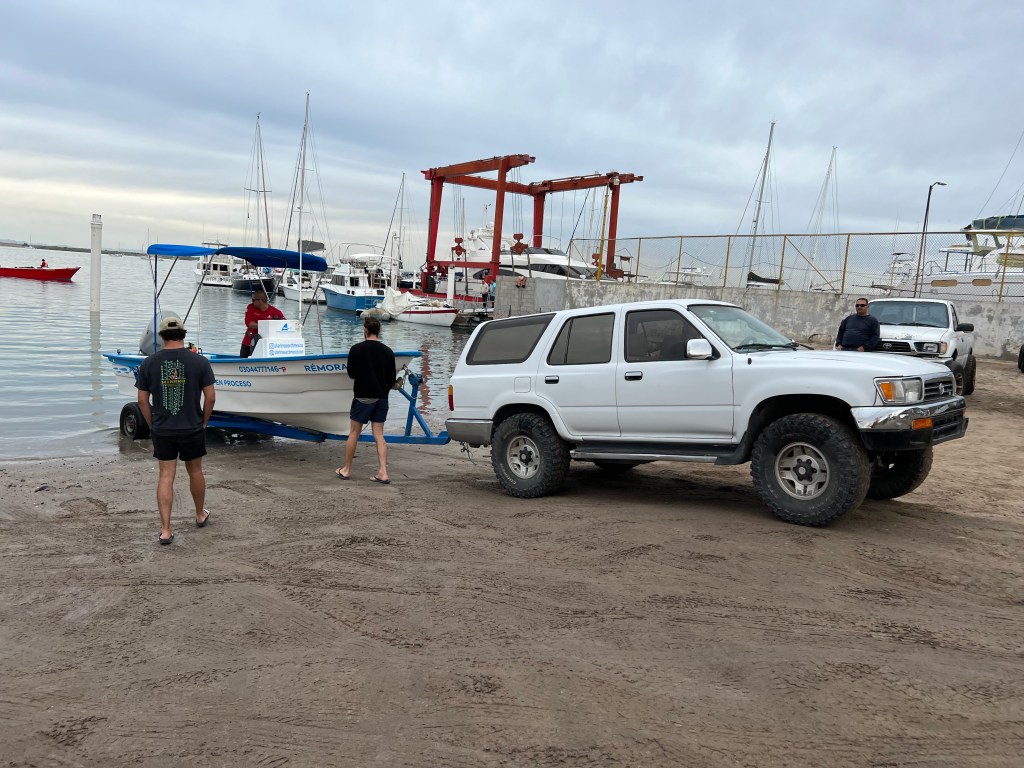 Vi kastar i ett plaströr med hål och lock som fyllts med fisk, skär upp fryst fisk i bitar och sätter på krokarna och släpper ner linan på botten, känner med fingret på linan när/om det nappar. På ett ställe är det något stort som är på min lina och nästan drar mig överbord – men lossnar tyvärr, mest troligt var det en liten haj. Vi är ute i ca 2,5 timme och provar flera ställen utan framgång och vänder tillbaka. Det enda vi fått upp är diverse småfiskar – bland annat en som ”snarkar” och en liten muräna. Pelikanerna håller sig nära båten och slickar sig om näbben när de ser att vi fått napp.