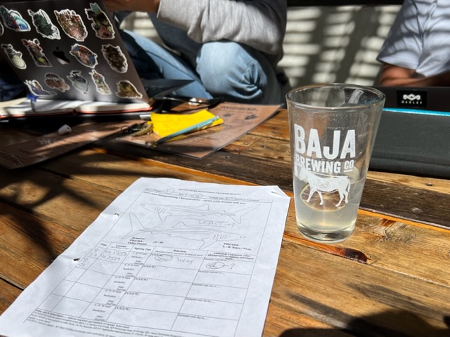 Vi gick till ett mysigt café i närheten och knappade in observationerna av valhajarna i ett excelark, uppgifter som tex tid, plats (koordinater), storlek, kön, vad den gör, ärr och om det finns foton från båda sidorna med mera. Tar sin lilla tid.