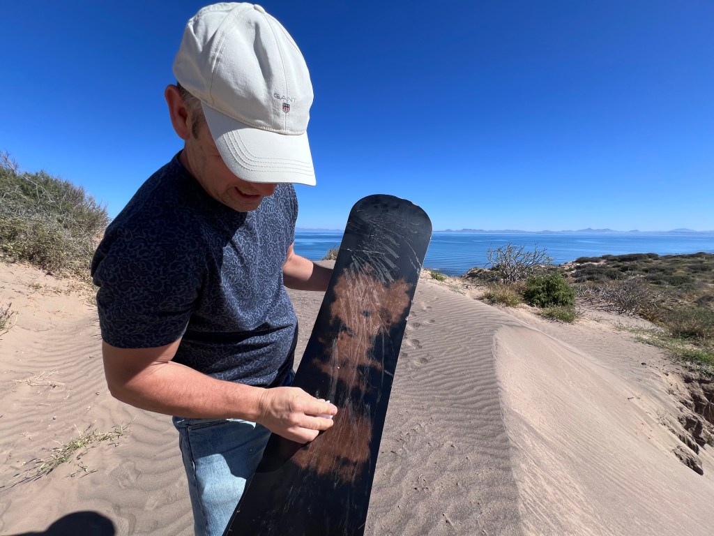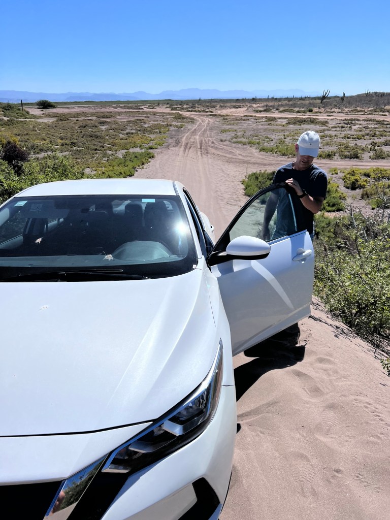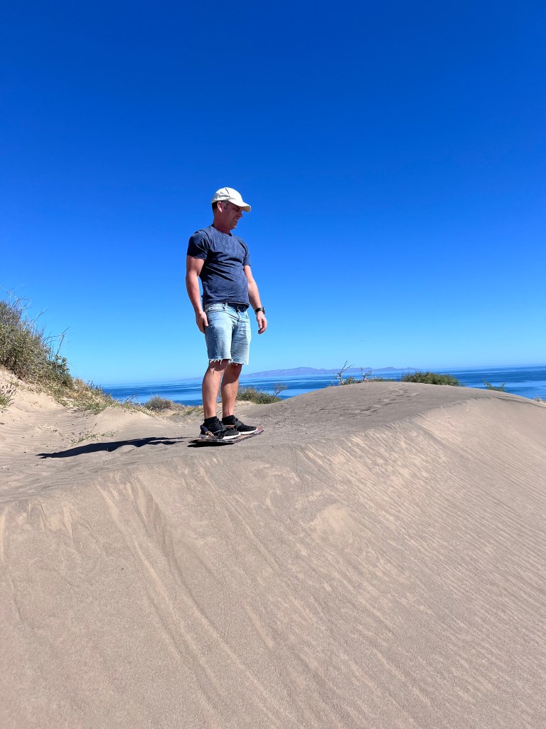 Idag på morgonen hyr vi en sandboard på samma ställe vi hyrt cyklarna. Man får med en bit vax för bra glid på sanden, vi betalade 200 pesos för en hel dag. Ut mot sanddynerna, dock har jag svårt att komma ihåg exakt var vi ska svänga av för att komma till de högsta sanddynerna där jag varit tidigare. Vi hittar några andra som Peter provar, men han får vaxa om brädan halvvägs då den varma sanden smälter bort vaxet. Vi letar vidare efter bättre sanddyner och då kör vi fast i sanden i en liten uppförsbacke. Vi får lägga oss i den varma sanden och börja skyffla bort sand under bilen, som tur är har vi brädan som underlättar en del. Det är supervarmt och inte alls kul. Efter ca 30 minuter stannar en jeep med två mexikanska män och en hund och hjälper oss tappert. Vi skyfflar, backar bilen och knuffar på i ca 20 minuter innan vi kommer loss. Vi dryper av svett allihopa, är så tacksamma och vill ge mexikanarna en slant att köpa något kallt att dricka men de tar inte emot det.