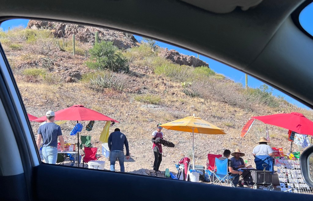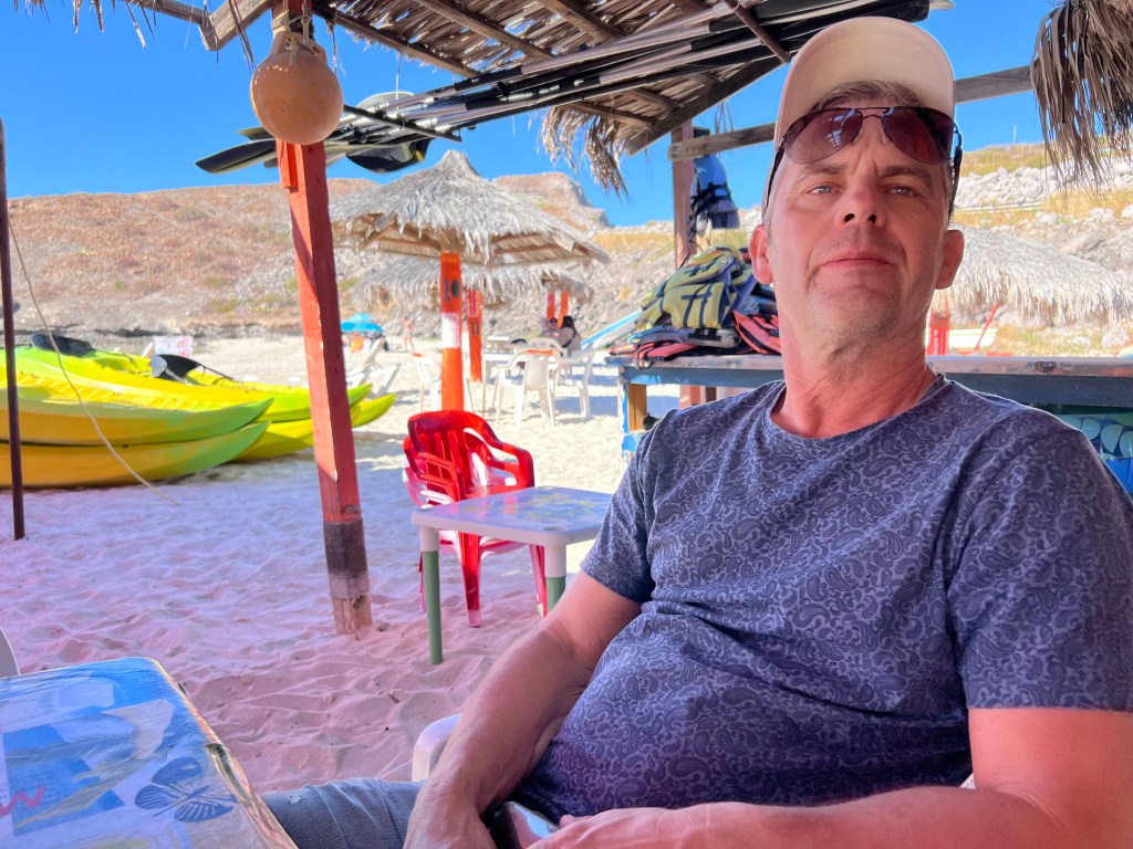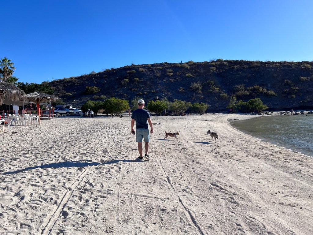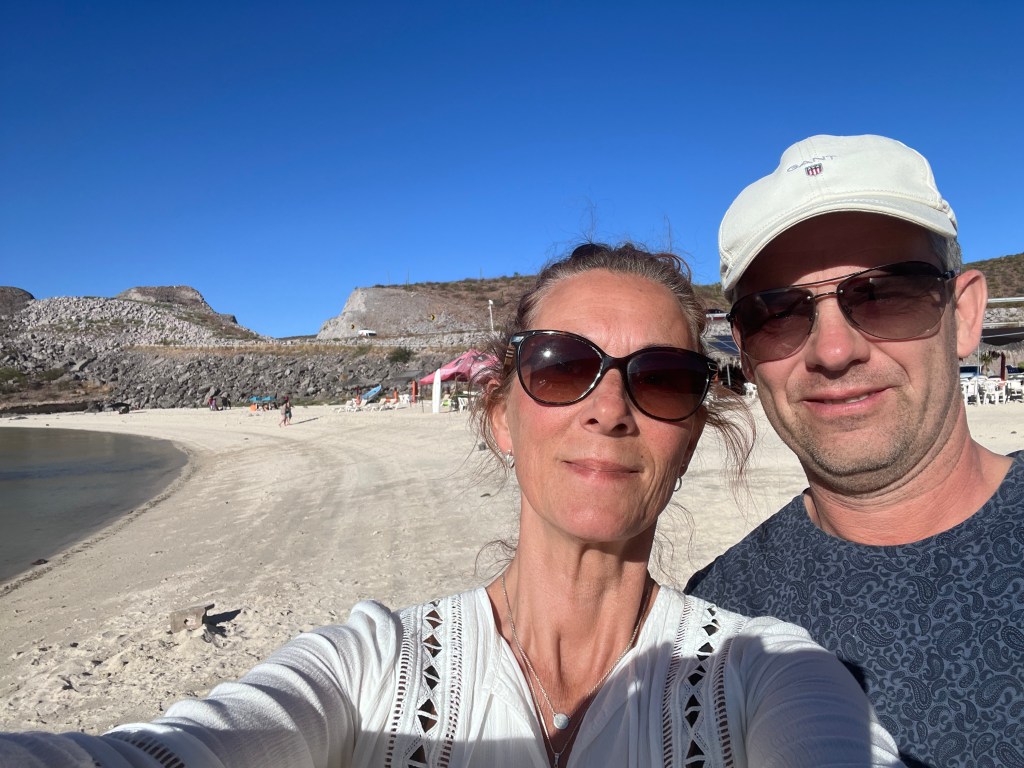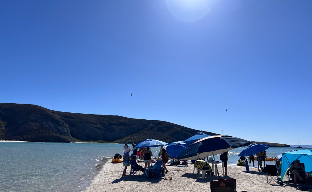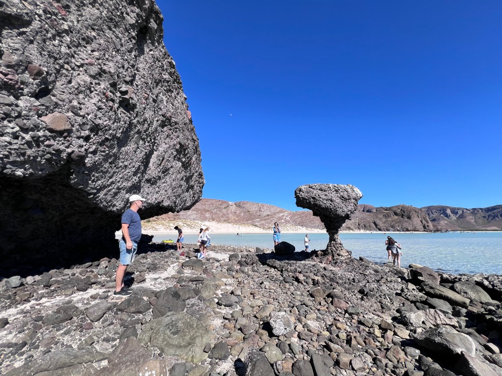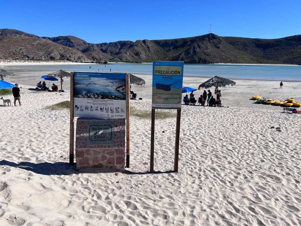 Playa Balandra är ett skyddat område och tillåter Max 450 personer under varje pass, vilket är 2 ggr/dag, kl.8-12 och kl.13-17. På stranden finns en svampformad klippa som är känd för stranden och det sägs att man inte varit i La Paz om man inte har sett den. Strax innan vi kom fram till ingången där vakter räknar in alla som kommer var det flera som satt vid vägrenen och sålde parasoller, dryck och snacks – men vi köpte inget då jag hade fått informationen att det fanns en restaurang på Playa Balandra som vi tänkte äta lunch på hungriga som vi var av allt grävande. Döm om vår förvåning när vi upptäcker att det inte alls finns NÅGOT att köpa där. Suck. Hungriga, inget vatten – men vi badar och slappar ett tag innan vi lämnar och åker till Playa Tesoro för att äta lunch kl.16. Det är den stranden jag cyklade till i början av min vistelse i La Paz men hade glömt telefonen och med den både pengar och möjligheten att fota.