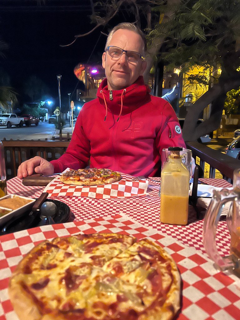 En rätt sen middag, pizza, vi satt ute fast det var rätt kallt.