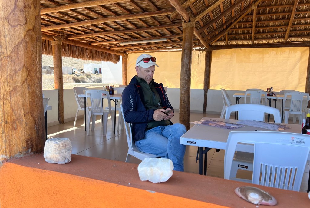 Just idag är det blåsigt och därför en del vågor på vattnet. Väl i sundet ”puffar” det överallt, det är många gråvalar på plats men de dyker ner ganska fort. Efter ett tag förflyttar vi oss en bit och där finns två nyfikna gråvalar som stannar kvar vid ytan och tittar på alla i båtarna som är på plats. En enormt häftigt upplevelse. Efter 30 minuter måste vi lämna gråvalarna enligt de regler som är, men de är fortfarande kvar vid ytan. Då åker vi till Magdalena Island för att äta lunch. Här bor ca 80 personer. Vår guide är son till San Carlos första borgmästare och han berättar om hur det var att växa upp i San Carlos.