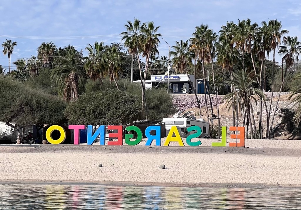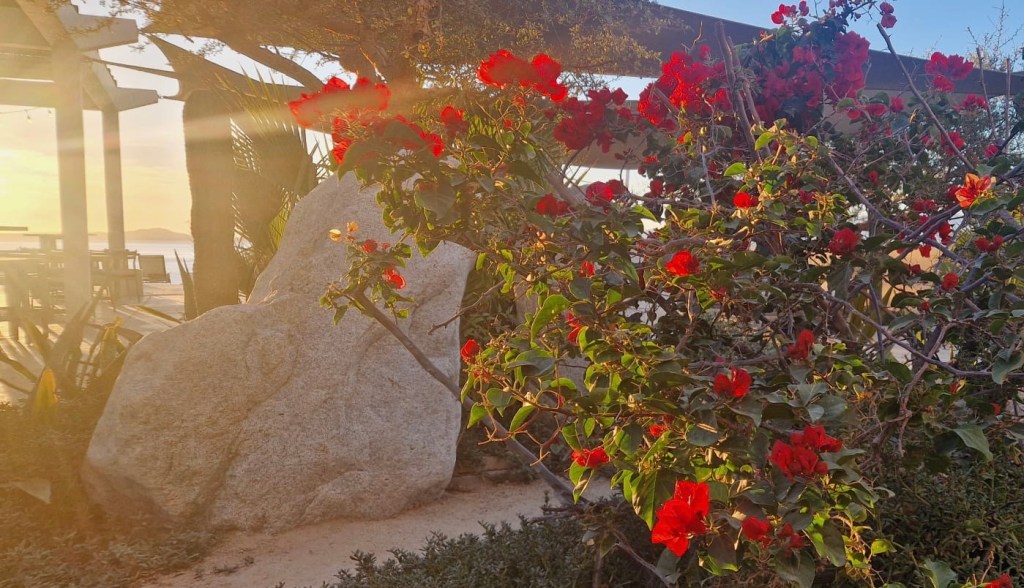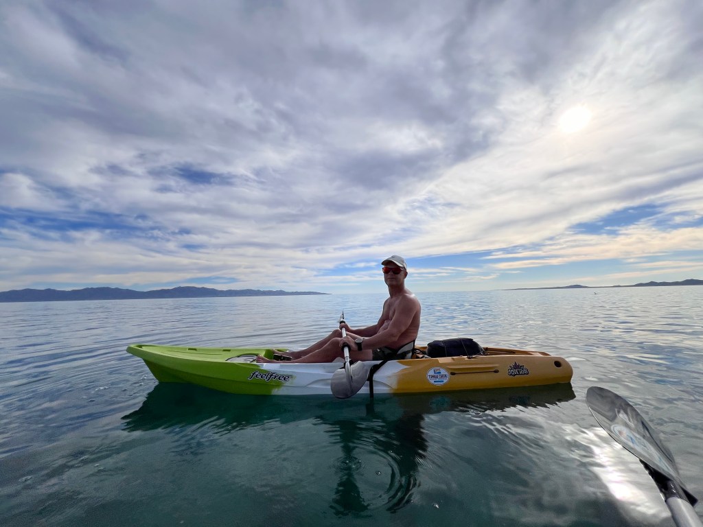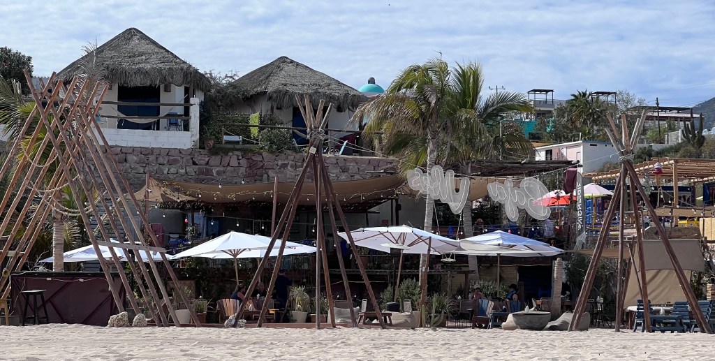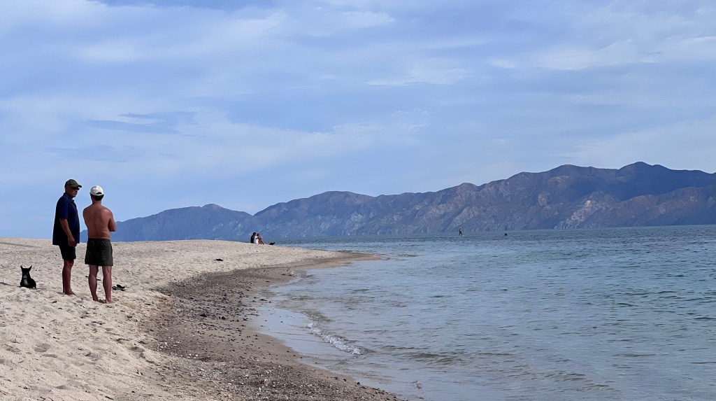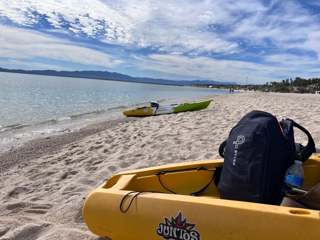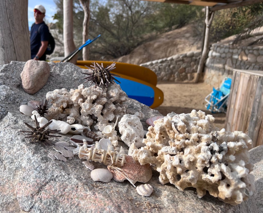 Idag är vår sista dag i Mexico och morgonsolen lyser vackert upp blommorna utanför vårt hotellrum. Vi lånar hotellets kajaker och paddlar norröver eftersom det är lugnt vatten på förmiddagen och blåser upp lite efter lunch så hjälper vinden oss tillbaka. Nere på stranden har någon gjort en fin samling av strandfynd på en sten. Vattnet är väldigt klart och trots djupet ser vi botten där vi paddlar fram. Vi har förundrats över hur folk vågar bygga hus på kullarna så nära vattnet och vi ser flera hus vars trappor ner till stranden har försvunnit. Efter ca 1,25 timme när vi passerat nästa ”samhälle” El Sargento ser vi en strandrestaurang och går iland – det är 2,5 timme kvar till restaurangen öppnar men vi stannar och badar, läser och Peter hittar en canadensare på stranden vars sondotter ska köra en motoriserad foilingboard för första gången med en vän till canadensaren. De pratar länge och väl. På stranden finns massor av bitar av korall, jättefina – och plötsligt dyker Peter upp med en glass som han köpte i en byggbod bredvid restaurangen.