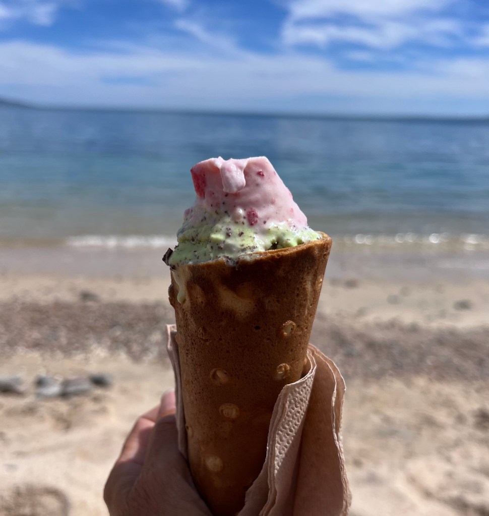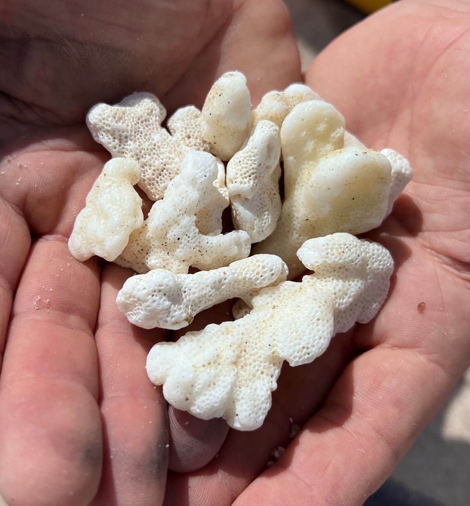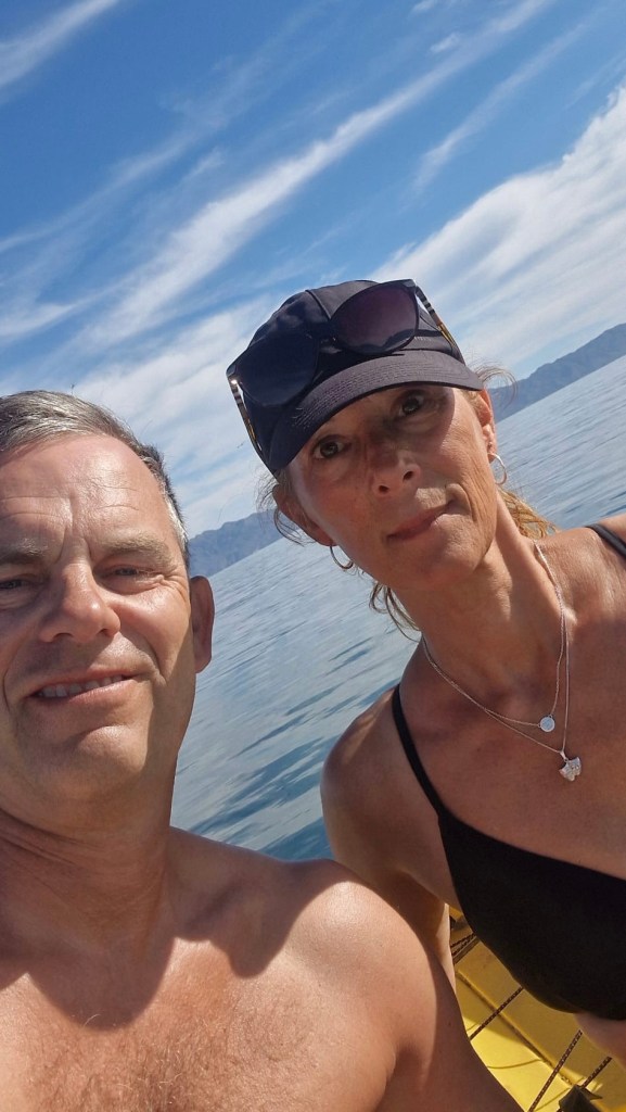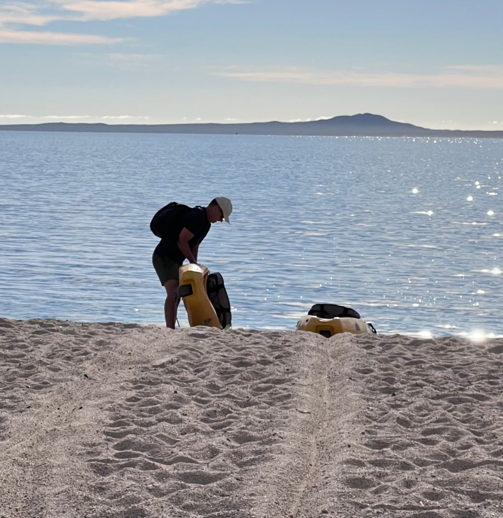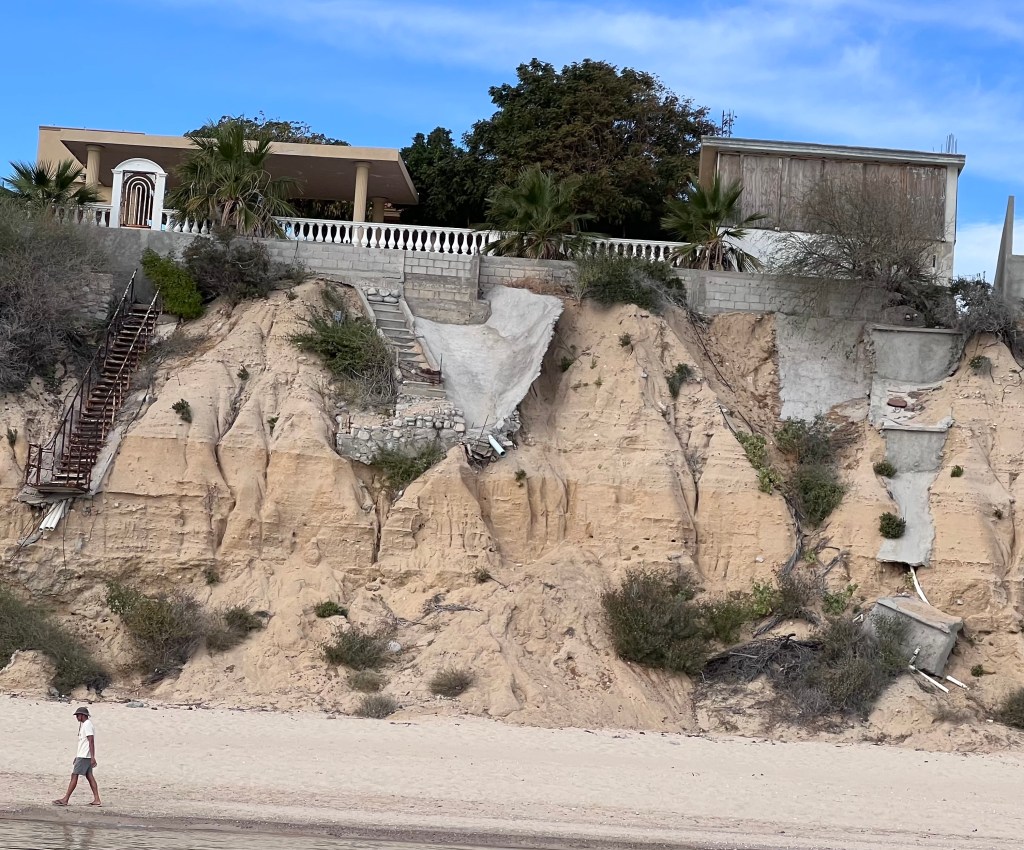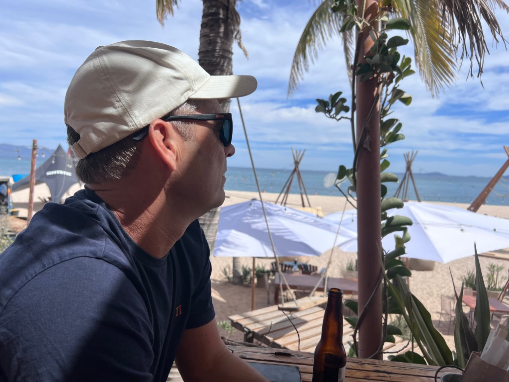 Idag är vår sista dag i Mexico och morgonsolen lyser vackert upp blommorna utanför vårt hotellrum. Vi lånar hotellets kajaker och paddlar norröver eftersom det är lugnt vatten på förmiddagen och blåser upp lite efter lunch så hjälper vinden oss tillbaka. Nere på stranden har någon gjort en fin samling av strandfynd på en sten. Vattnet är väldigt klart och trots djupet ser vi botten där vi paddlar fram. Vi har förundrats över hur folk vågar bygga hus på kullarna så nära vattnet och vi ser flera hus vars trappor ner till stranden har försvunnit. Efter ca 1,25 timme när vi passerat nästa ”samhälle” El Sargento ser vi en strandrestaurang och går iland – det är 2,5 timme kvar till restaurangen öppnar men vi stannar och badar, läser och Peter hittar en canadensare på stranden vars sondotter ska köra en motoriserad foilingboard för första gången med en vän till canadensaren. De pratar länge och väl. På stranden finns massor av bitar av korall, jättefina – och plötsligt dyker Peter upp med en glass som han köpte i en byggbod bredvid restaurangen.