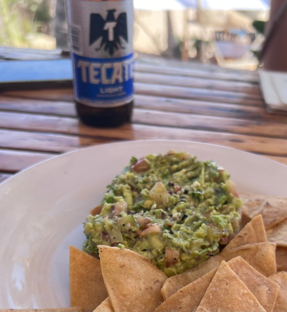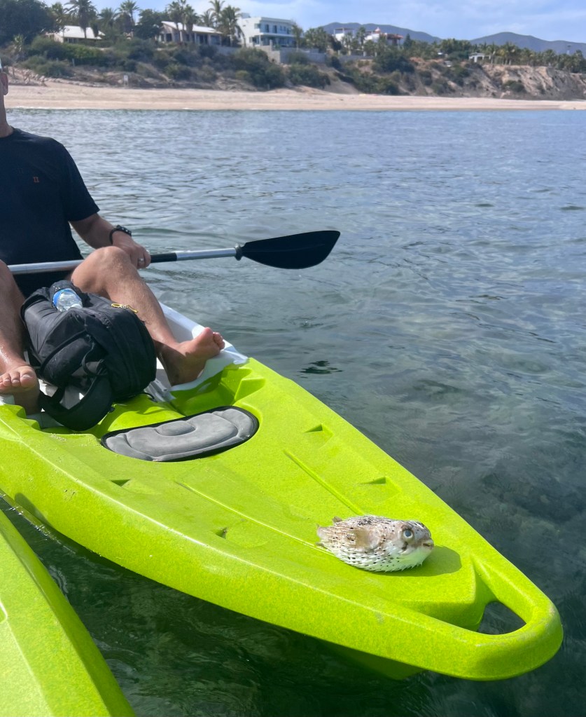 När restaurangen öppnar beställer vi öl, guacamole (den godaste någonsin), hamburgare och fisktacos – allt var gott. När vi ska paddla tillbaka blåser det lite och det är lite vågor som går in mot land – när Peter puttar ut sin kajak och sätter sig i den voltar den av en våg och både Peter och ryggsäcken blev blöta. Det tar oss bara 45 minuter tillbaka. Vi ser något vitt med taggar som flyter på vattnet – det är en död pufferfisk. Peter lyfter upp den på kajaken och vi tittar på den en kort stund innan den får återgå till vattnet- den luktar illa, som en död akvariefisk.
