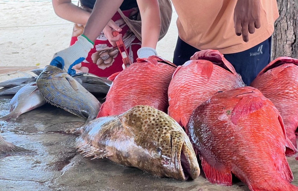 På fiskmarknaden var det full fart idag, mycket fisk och mer fisk som tillkom under auktionens gång, tex röd snapper och långnosad emperor. Någon fiskare hade råkat få stingrockor och en liten typ av haj på kroken kom också – men jag lägger inte ut foton på det. Det var två skickliga personer som fjällade och styckade upp fisk till de personer som beställt det.