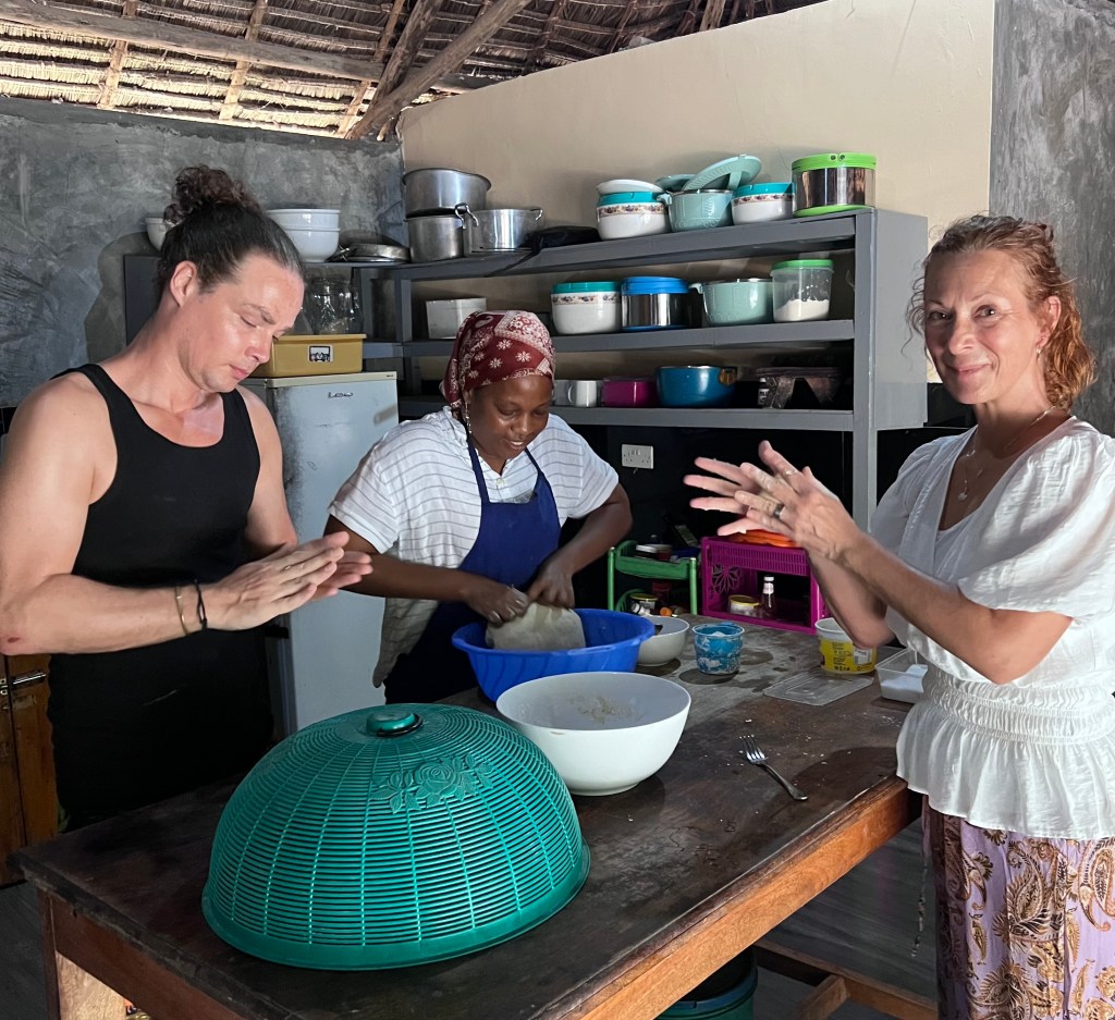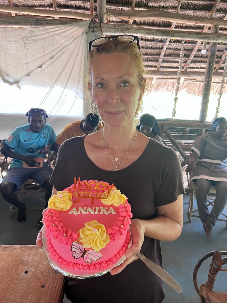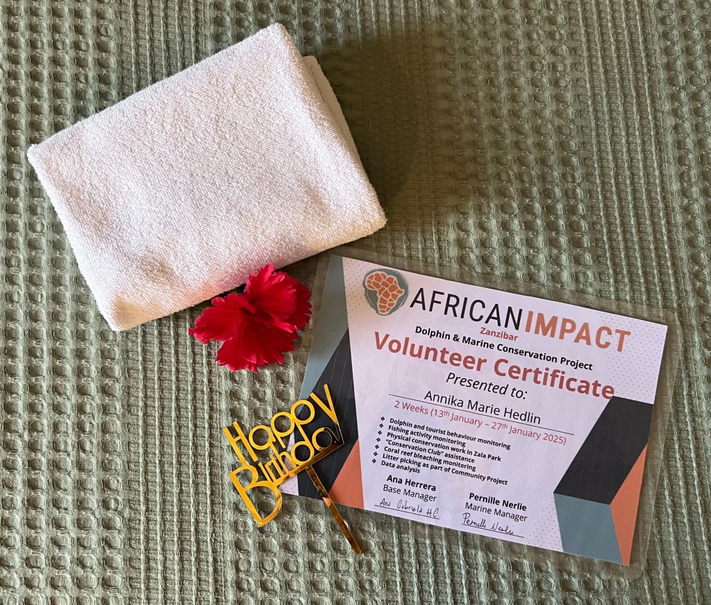 Idag är det min födelsedag. För sista gången går jag till ”jobbet” och passerar muren med allt glassplitter. Vi har en förmiddag på basecamp där vi jobbar ikapp med tex att föra in data från de observationer vi inte hunnit med än men även maila bilder på koraller för att visa hur de mår. Efter lunch fick vi volontärer som nu lämnar våra projekt ett inplastat ”volontärcertifikat” och när jag diskar min tallrik kommer all personal upp med en rosa tårta med mitt namn på och gratulerar mig – på swahili ”Basdeei njema”. Jag blir rörd över uppvaktningen, så gulligt av alla. Den marinbiolog som jobbar i teamet och han som ansvarar för alla utflykter mm dansar en kort dans. På eftermiddagen plockar vi skräp i området, supervarmt i solen. Vi får ihop många säckar på knappt 1 timme. Det känns bra, också då vi kanske på något sätt är goda förebilder (?). Till hotellet där personalen bäddat iordning min säng med blommor, en snabbdusch för att snart vara på basecamp och vara med för att lära mig att göra chiapatabröd, jag har lagt ut någon bild på det tidigare. Det är jag och en annan volontär som anmält oss. Det är verkligen en konst att få till alla moment, men vi har bra stöttning. Man har ett speciellt litet, runt bord på 3 fötter till brödet – kvinnan i köket kommer att köpa ett sådant bord med kavel till mig för 30 000 TZS, men jag ger henne 40 000 TZS. De bröd vi gör äter vi alla sedan till middag. Sedan hejdå och till hotellet för att fortsätta packa. Imorgon kommer taxin och hämtar och kör mig till Nungwi där jag på eftermiddagen ska göra ett dyk.