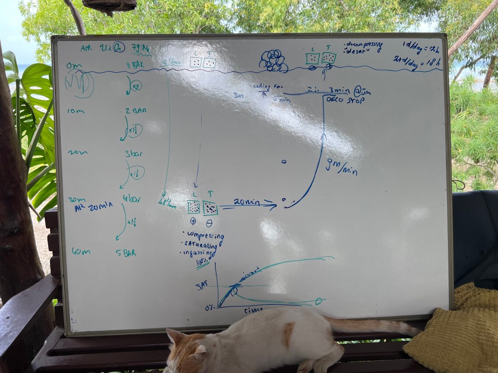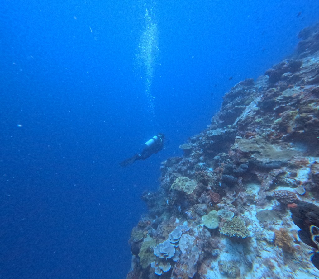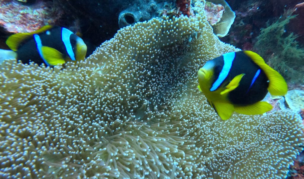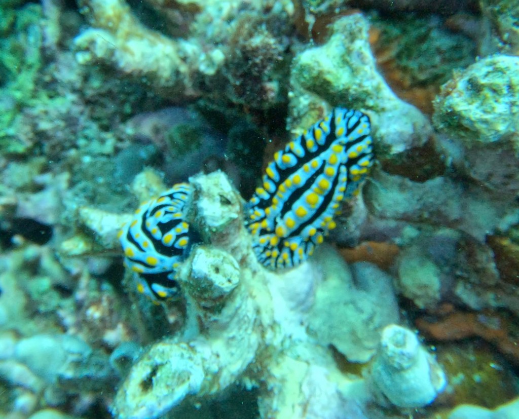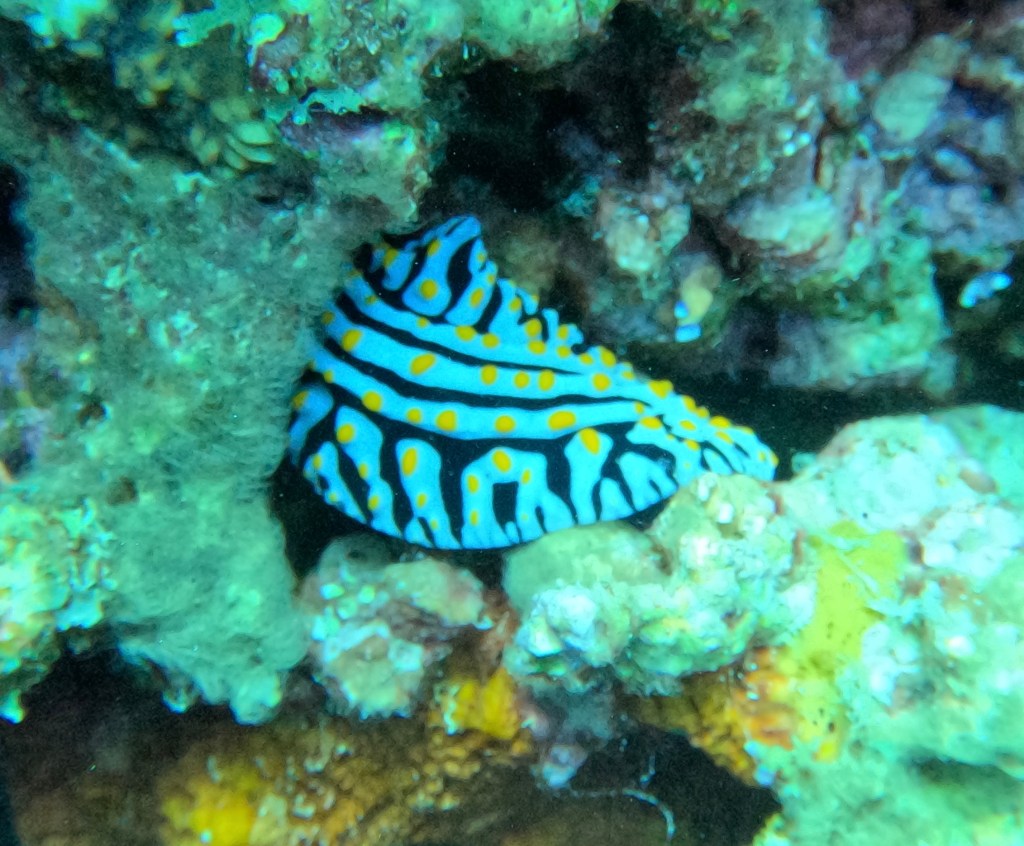 Jag hämtas kl.08.00 efter frukost och taxiresan tar kanske 15 minuter, chauffören stannar två gånger och öppnar fönstret för att ge mig en bit bark av kanelträdet och citrongräs. Doftar ljuvligt. tDykcentret ligger precis vid stranden. Det är jag och en man till (från Schweiz) som ska få oss en genomgång av Nitrox fördelar och nackdelar innan vi ger oss ut med gummibåten för att göra två dyk. Han som äger och driver stället (från Europa någonstans) håller ett högt tempo där han använder hela kroppen när han informerar om Nitrox. Vanlig luft innehåller 21% syre och när man dyker med Nitrox innehåller den 30% eller 32% syre – vilket gör att man får längre bottentid, inte blir lika trött som dykning med luft. Nackdelen är att man samlar på sig mer kväve som behöver ”vädras ut”. Första dyket tar jag inte med mig GoPro då jag vill fokusera på andning och flytkraften, den sistnämnda är det svåraste att behärska – vilket man gör med andningen. Så alla bilder från dykningen är från dyk 2. Vi ser många nakensnäckor (nudibranch) som är pyttesmå – men vår dykinstruktör vet var han ska leta. När vi gjort första dyket ska vi vänta ca 1 timme för att ”vädra ut” kvävet innan vi gör dyk 2. Väntan gör vi på en strand och får frukt, pannkakor, ingefärathé (starkt och gott). Jag får åka motorcykeltaxi tillbaka till hotellet – liiite bökigt att sitta på en motorcykel med sarong och samtidigt se till att knäna inte syns. Går sådär. Äter lunch på strandrestaurangen och sitter sedan en stund på terrassen vid vattnet innan jag äter middag.