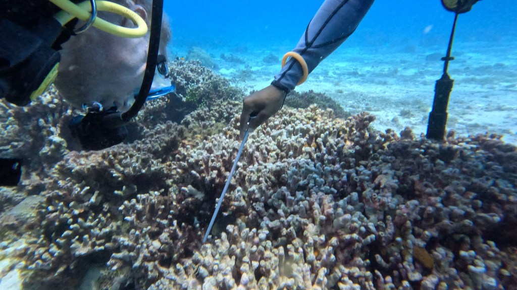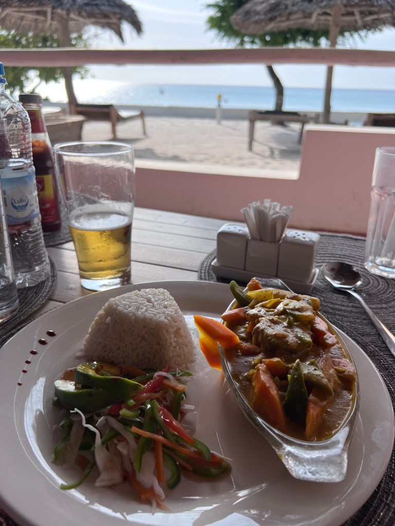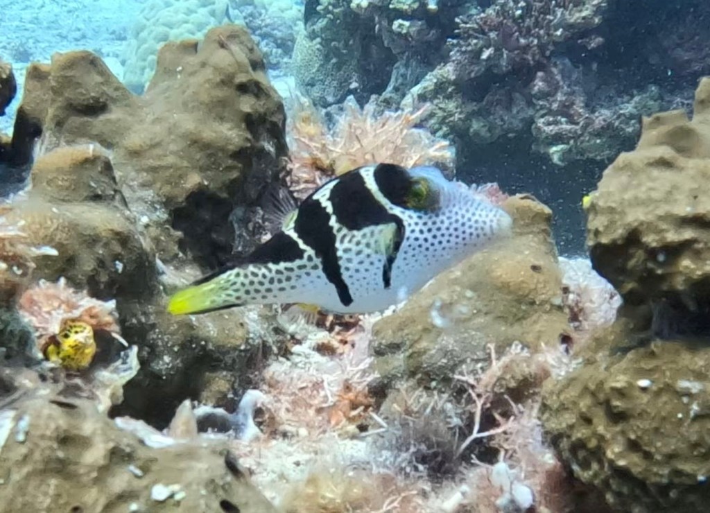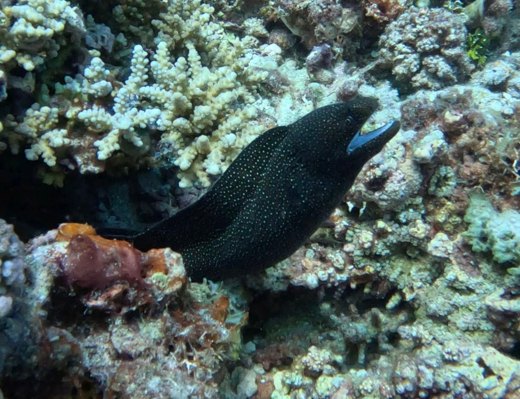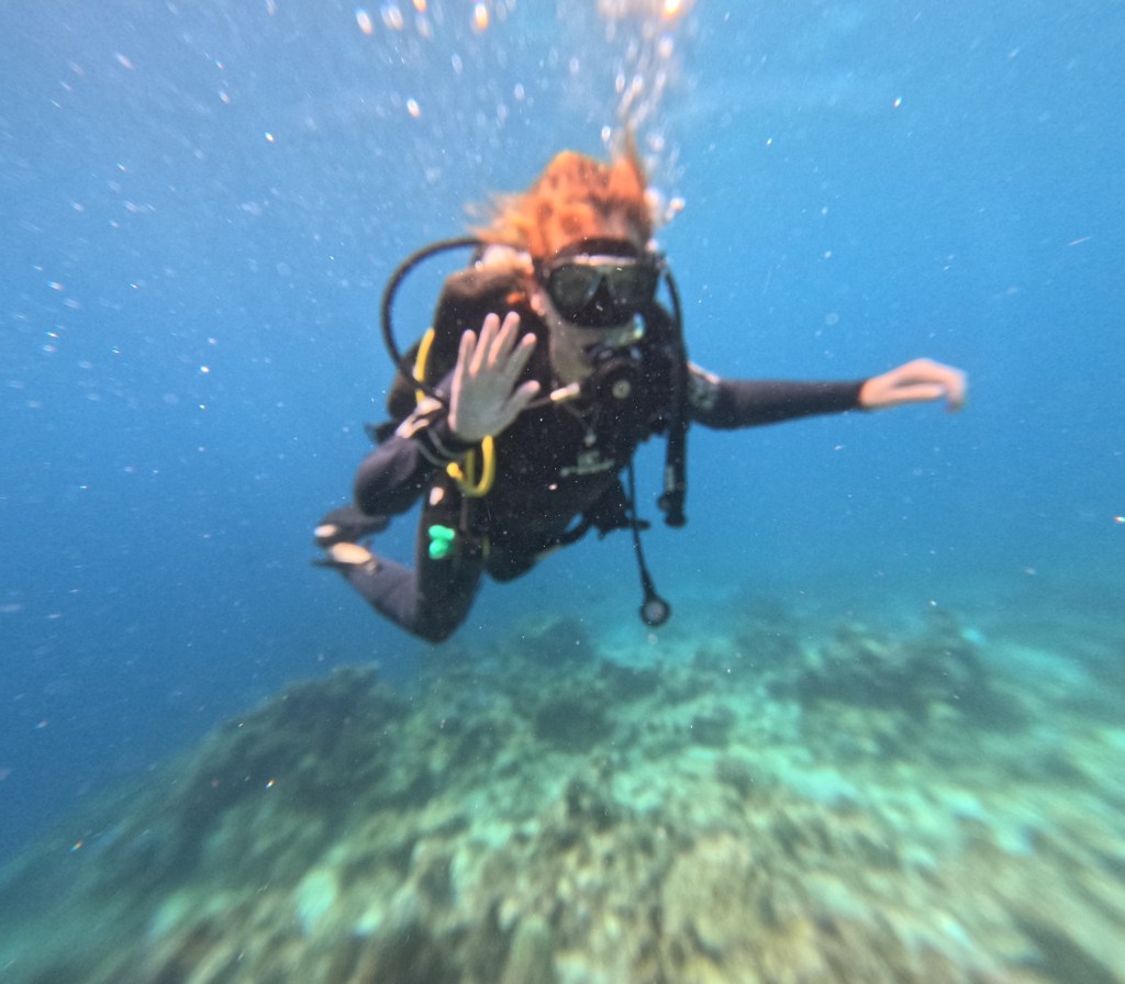 Jag hämtas kl.08.00 efter frukost och taxiresan tar kanske 15 minuter, chauffören stannar två gånger och öppnar fönstret för att ge mig en bit bark av kanelträdet och citrongräs. Doftar ljuvligt. tDykcentret ligger precis vid stranden. Det är jag och en man till (från Schweiz) som ska få oss en genomgång av Nitrox fördelar och nackdelar innan vi ger oss ut med gummibåten för att göra två dyk. Han som äger och driver stället (från Europa någonstans) håller ett högt tempo där han använder hela kroppen när han informerar om Nitrox. Vanlig luft innehåller 21% syre och när man dyker med Nitrox innehåller den 30% eller 32% syre – vilket gör att man får längre bottentid, inte blir lika trött som dykning med luft. Nackdelen är att man samlar på sig mer kväve som behöver ”vädras ut”. Första dyket tar jag inte med mig GoPro då jag vill fokusera på andning och flytkraften, den sistnämnda är det svåraste att behärska – vilket man gör med andningen. Så alla bilder från dykningen är från dyk 2. Vi ser många nakensnäckor (nudibranch) som är pyttesmå – men vår dykinstruktör vet var han ska leta. När vi gjort första dyket ska vi vänta ca 1 timme för att ”vädra ut” kvävet innan vi gör dyk 2. Väntan gör vi på en strand och får frukt, pannkakor, ingefärathé (starkt och gott). Jag får åka motorcykeltaxi tillbaka till hotellet – liiite bökigt att sitta på en motorcykel med sarong och samtidigt se till att knäna inte syns. Går sådär. Äter lunch på strandrestaurangen och sitter sedan en stund på terrassen vid vattnet innan jag äter middag.