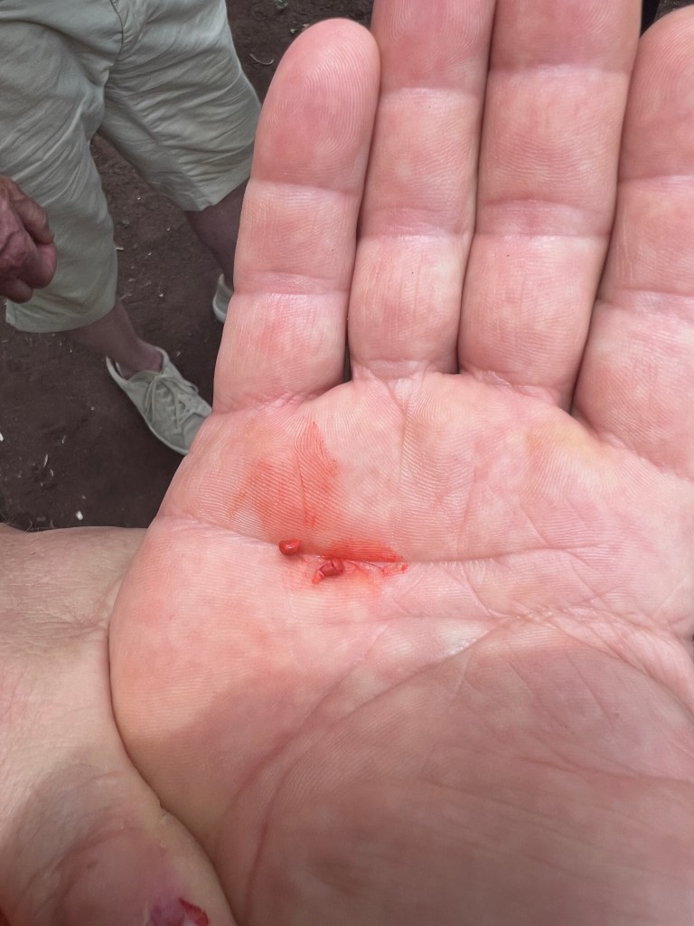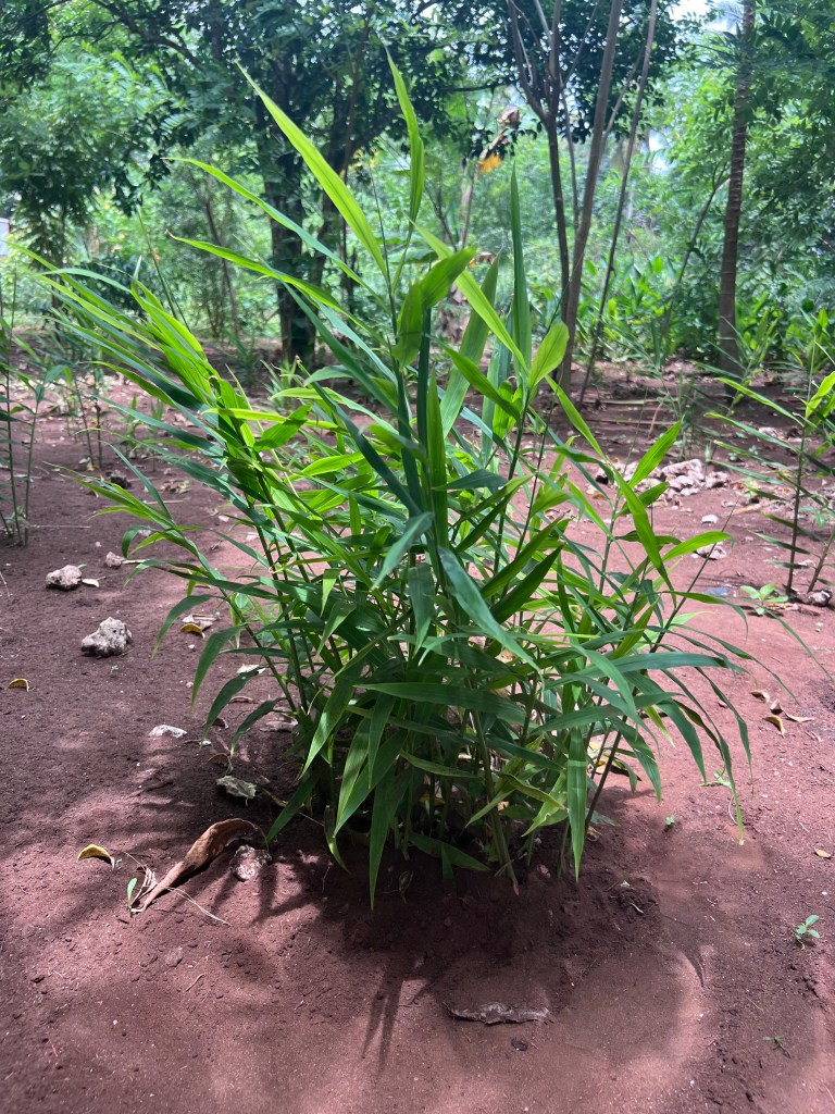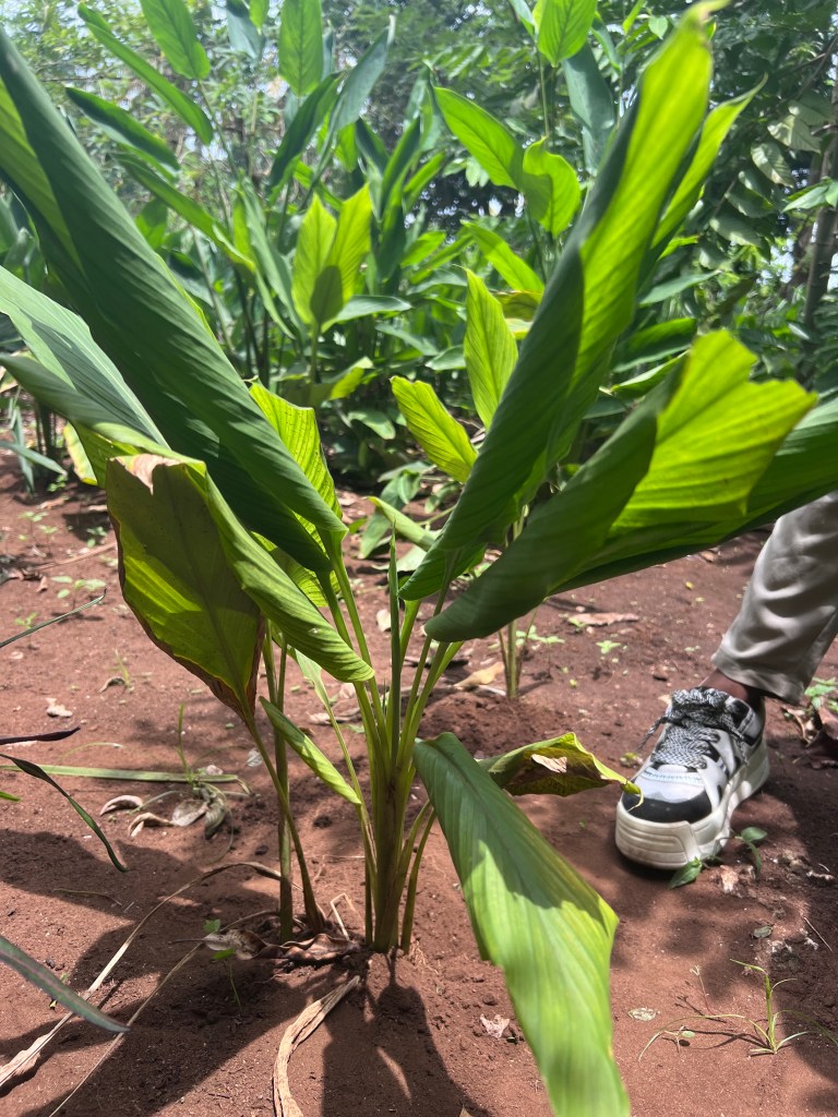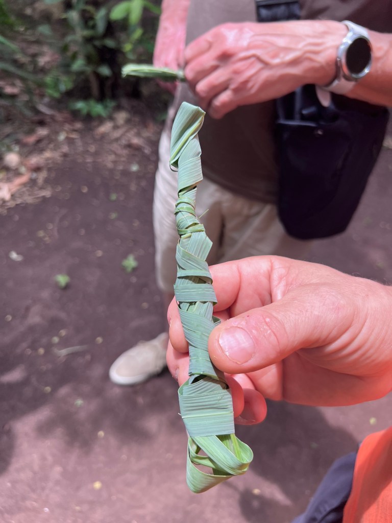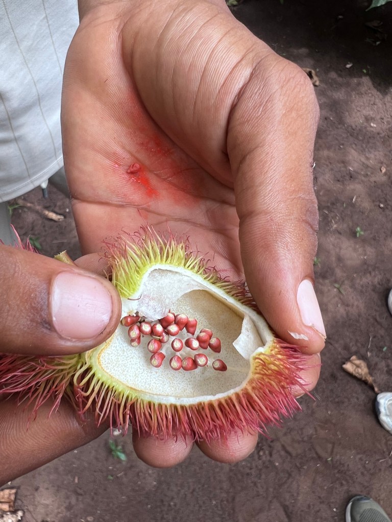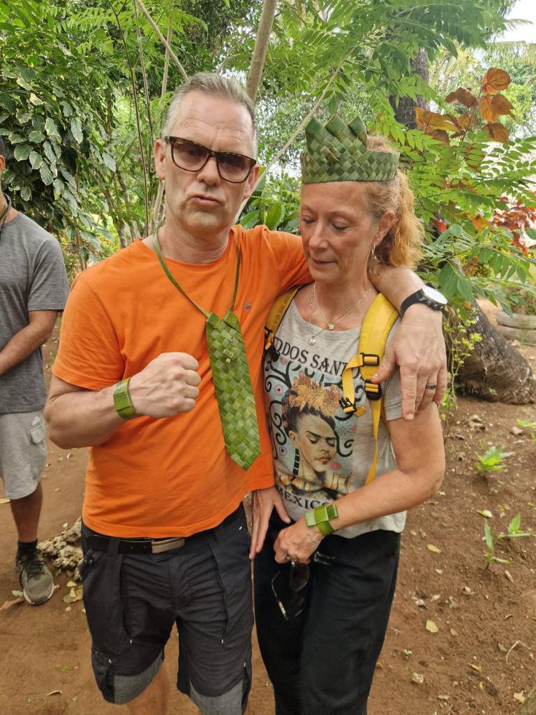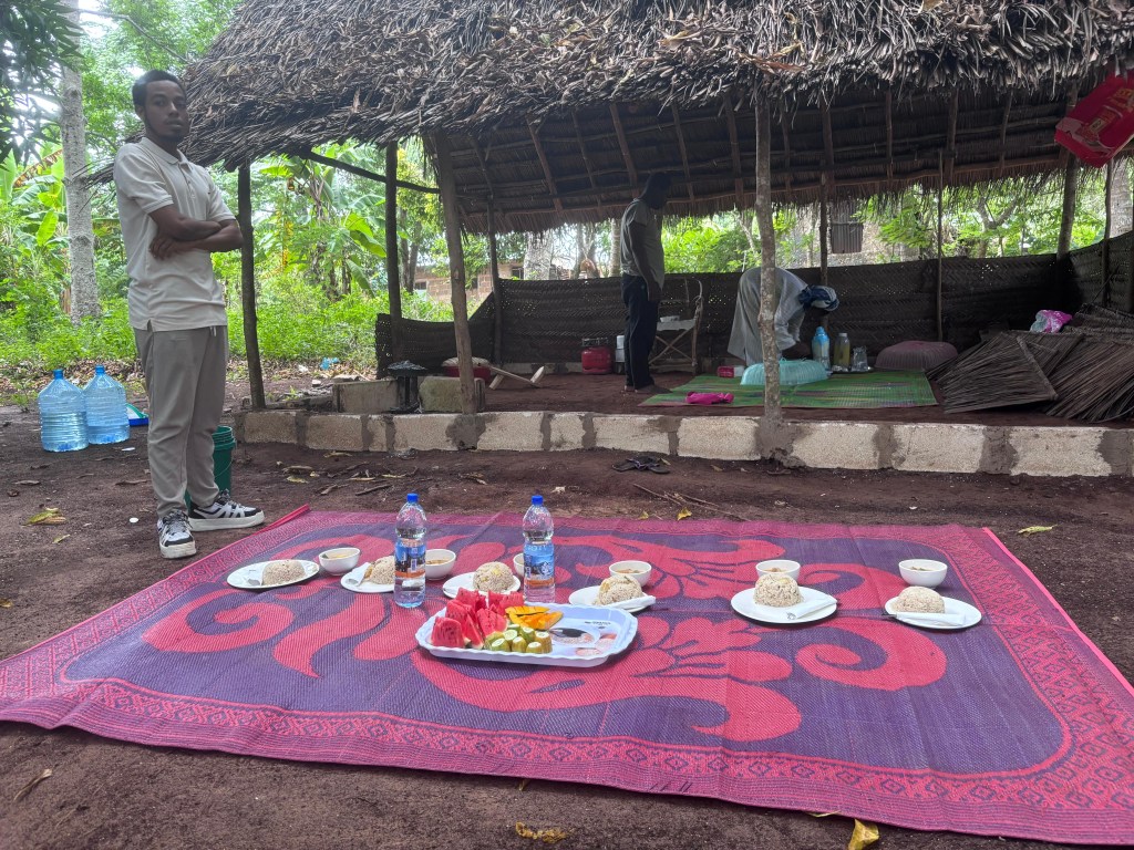 Efter parken åker vi till en ”kryddfarm” för att få se hur kryddorna växer, vilka användningsområden de har utöver att vara krydda. En liten frukt med taggar kallad ”lipstick” har frön som avger en röd/brun/orange färg när man mosar dom – färg som kvinnorna målade läpparna med förr. Vi ser kanelträd, peppar, ingefära, gurkmeja, vanilj, citrongräs som vi får snurra ihop på ett speciellt sätt så man kan stoppa ner i en kopp och göra thé. Peppar och vanilj måste växa på något, ha ett annat träd att slingra sig upp på. Innan man kan skörda vanilj måste man vänta ca 5 år! Inte undra på att vaniljstänger är så dyrt. Vi blir påklädda kronor/armband/slipsar flätade av palmblad. När turen är slut får vi äta lunch, de breder ut en stor plastmatta på marken och dukar åt oss. Den måltiden var bland det godaste jag ätit under min tid på Zanzibar. Riset var kryddat med en mängd kryddor (bl.a. nejlika) och smakade underbart. Innan vi lämnar farmen klättrar en kille upp i en kokospalm för att plocka kokosnötter till oss – och vi ska sjunga när han klättrar upp. Han öppnar dom åt oss och vi får dricka kokosvattnet och smaka på kokosen som är mjuk, sladdrig och geleaktig.