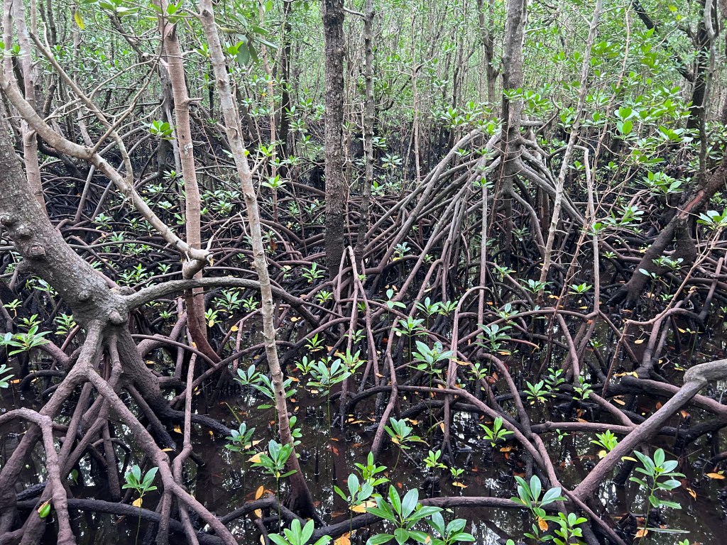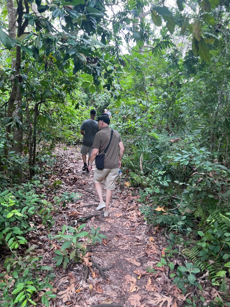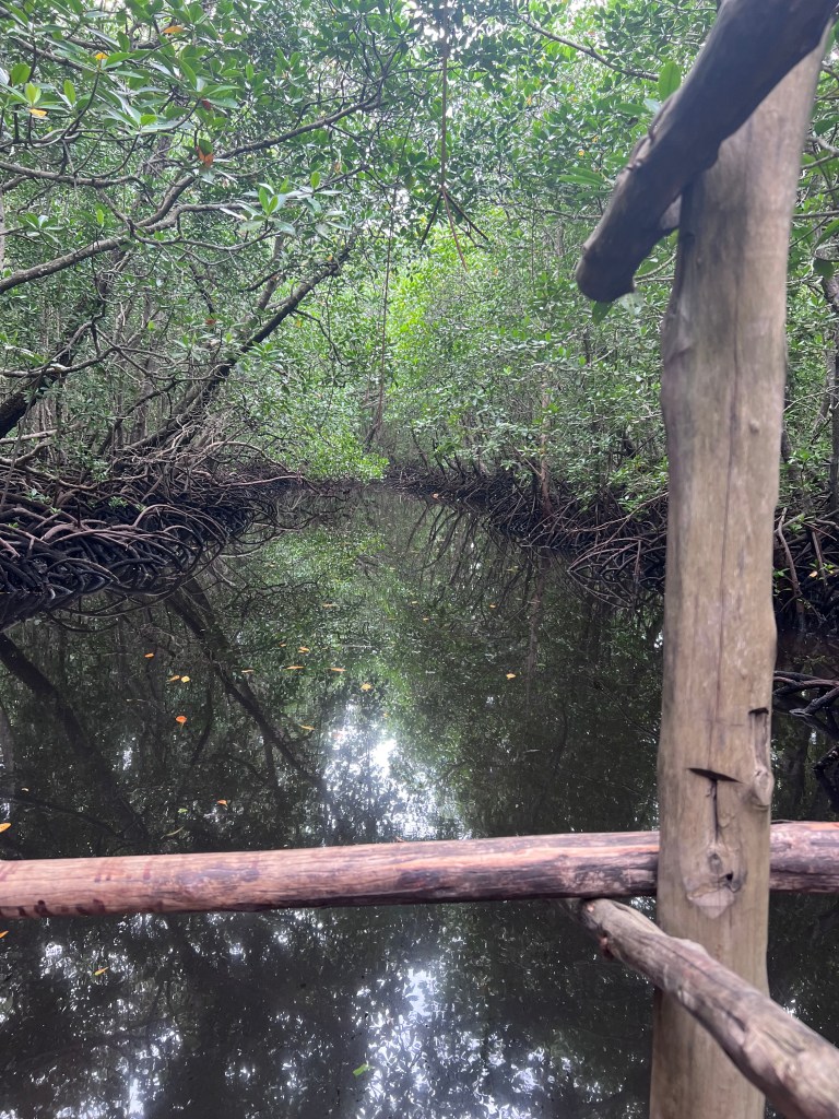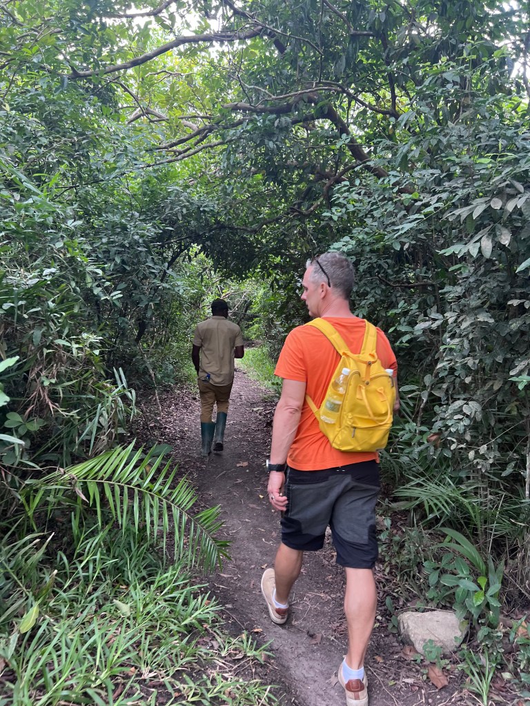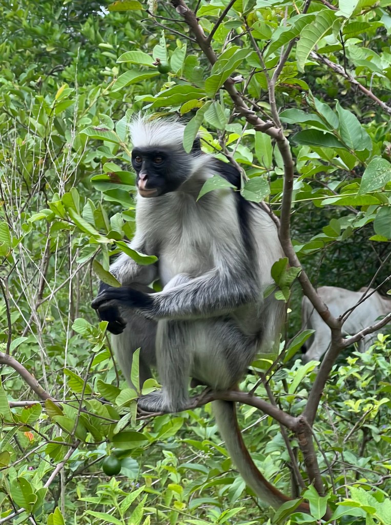 Klockan 8 kommer taxin och hämtar oss alla 6 för att ta oss till Jozani Forest, den enda nationalparken på Zanzibar. Det första guiden visar oss är en pytteliten groda, omöjlig att upptäcka för ett otränat öga. Här finns bland annat den utrotningshotade apan ”red Colobus”. Guiden tar oss runt i skogen och vi ser många apor, de äter löv och sitter i träd där en rund grön omogen frukt växer (ser nästan ut som lime), apornas magar tål inte sött/socker – om de kommer över kol äter de gärna det för att hjälpa matsmältningen. Här växer t.ex. mahogny. Vi går igenom ett mangroveträsk innan turen är slut.